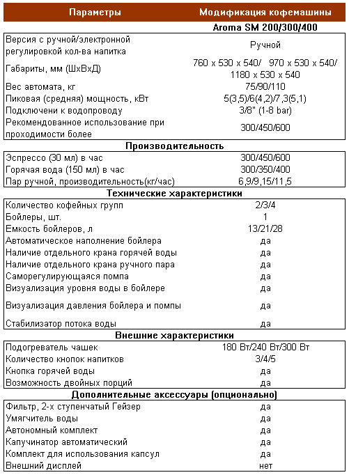 В каждой кофемашине линии Aroma предусмотрен кран подачи горячей воды, трубка выдачи пара (для приготовления капучино) и панель для подогрева чашек. Благодаря большому бойлеру система может одновременно готовить кофе, кипяток и пар.