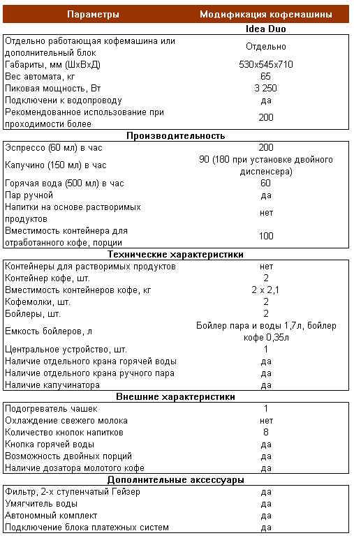 Особенности: производительность до 200 напитков в час; использование двух сортов зернового кофе, имеется сушка для чашек, наличие автоматического капучинатора.